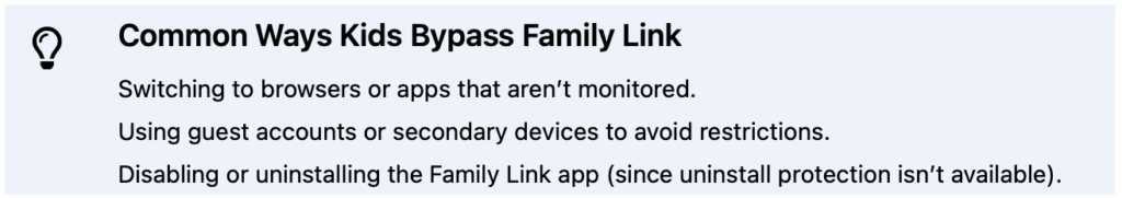 Yes, tech-savvy children can sometimes find ways around screen time limits, app restrictions, or device supervision if only Family Link is used.