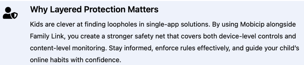 Mobicip adds a crucial extra layer of protection. With features like content filtering, detailed activity reports, cross-platform coverage, co-parent controls, and uninstall protection, it complements Family Link to create a stronger safety net. Layered protection matters because kids often find ways around single-app solutions, and combining tools helps parents stay informed, enforce rules, and guide safe online behavior.